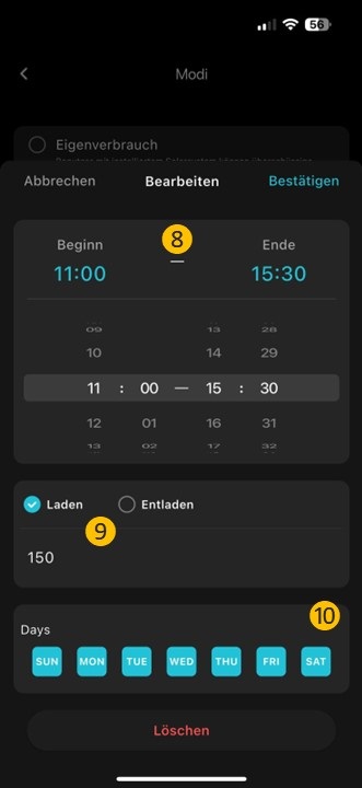 Manueller Modus: Zeitpläne definieren (Zeitfenster + gewünschte Eingangs- bzw. Ausgangsleistung).