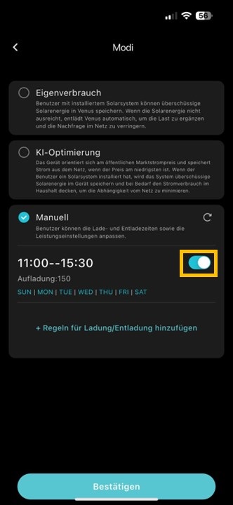 - Betriebsmodus auswählen – Eigenverbrauch, KI-Optimiert oder Manuell