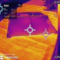 In diesem Bild habe ich je einen Messpunkt auf den Modulen (32,8 – 37,4°C) und einen auf der Dachhaut (50,9°C) angelegt. Interessant wie war das Dach im Vergleich zum Solarmodul ist.