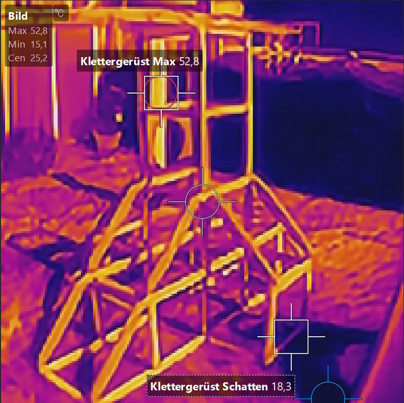 Ein Beispiel aus dem Test: Das Klettergerüst (siehe unten) in der Sonne wurde deutlich heißer als erwartet. Solche Aufnahmen sind nicht nur technisch interessant, sondern auch praktisch nützlich im Alltag.